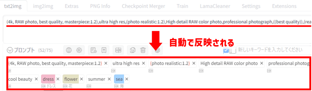 「Prompt All in One」の項目に自動で反映されます。