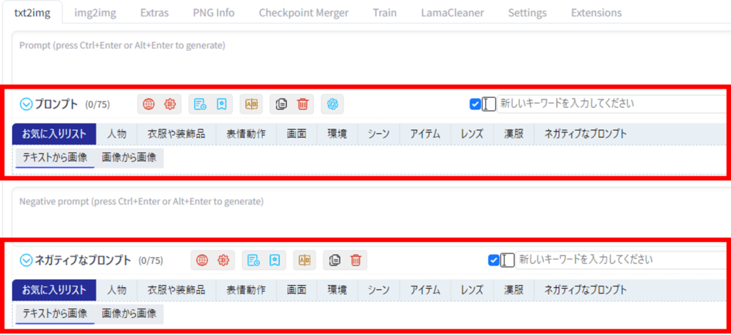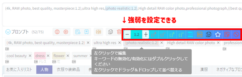 この他にも、ボタン1つでプロンプトの強弱を設定できたり、ドラッグするだけで並び替えができたり、様々な機能があります。