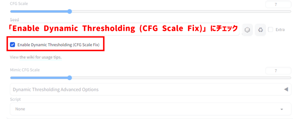 インストールが完了すると設定項目の中に「Enable Dynamic Thresholding (CFG Scale Fix)」という項目が追加されるのでチェックを入れます。