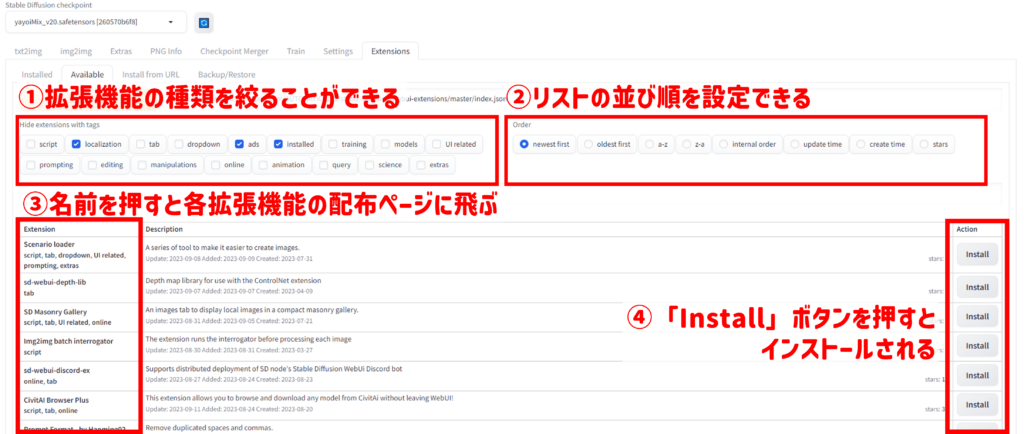 つぎに、Stable Diffusion内にある拡張機能リストから導入する方法です。
