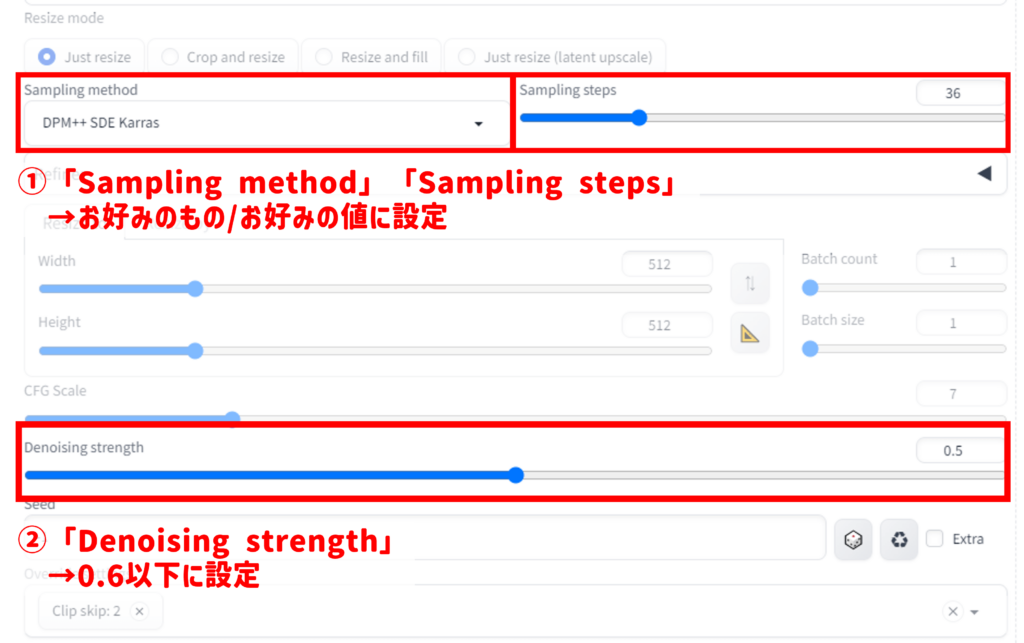 まずは「Sampling method」「Sampling steps」「Denoising strength」の設定をします。