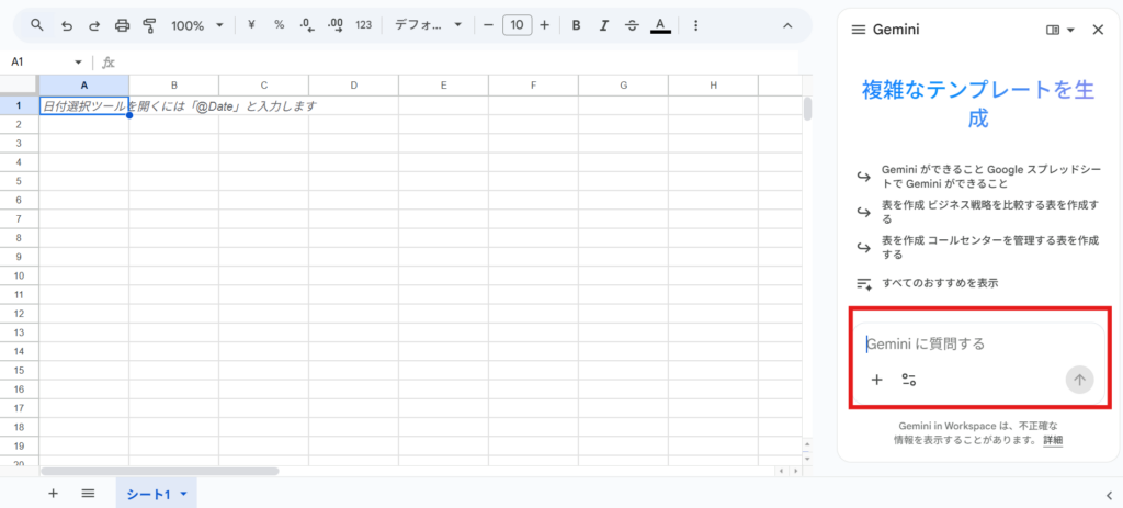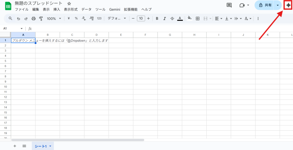 スプレッドシートを開き、画面右上にある「✨(キラキラマーク)」のGeminiアイコンをクリックします。