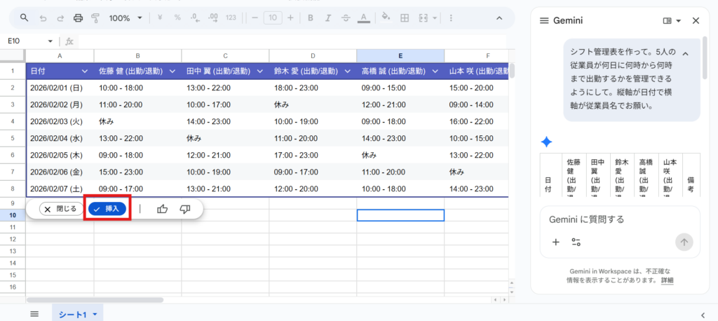 AIが生成した表や数式を確認し、「挿入」ボタンを押せばシートに反映されます。