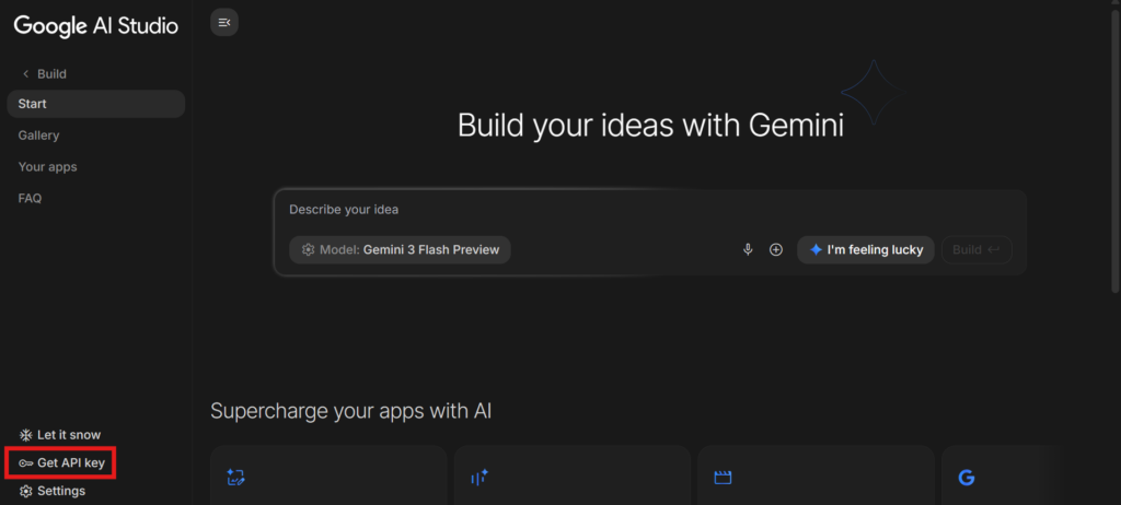 Google AI Studioにアクセスし、Googleアカウントでログインします。次に、「Get API key」をクリックしてください。