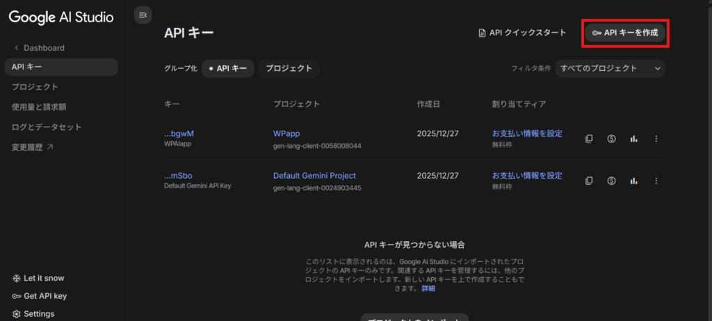 次に「APIキーを作成」をクリックし、新しくAPIキーを作成してください。その際に設定は全てデフォルトで大丈夫です。