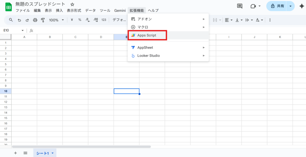 まず、スプレッドシートのメニュー「拡張機能」→「Apps Script」をクリックします。