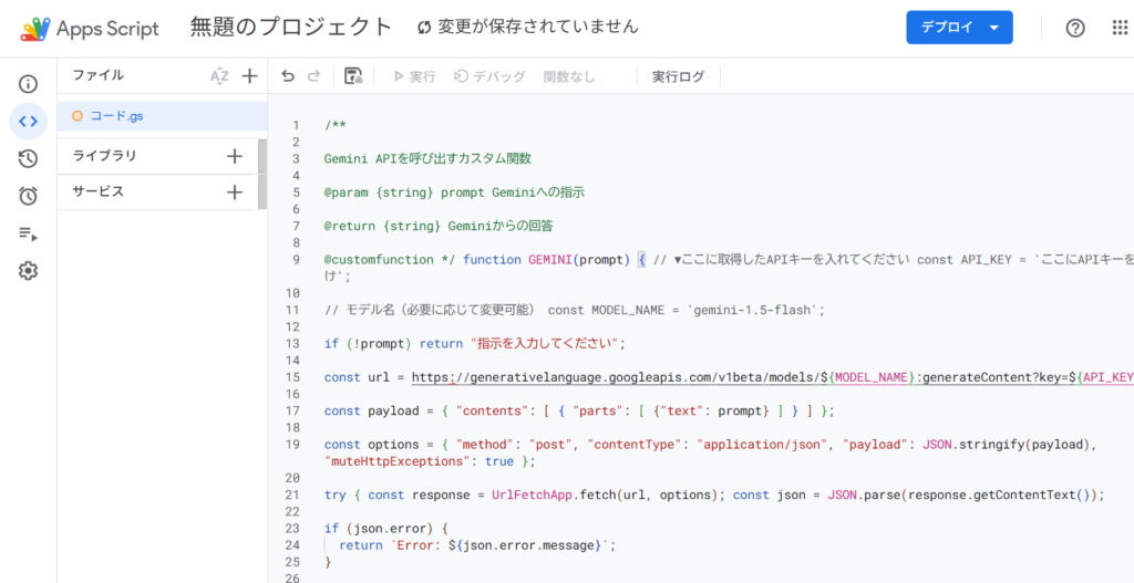 'ここにAPIキーを貼り付け'の部分を、先ほど取得したAPIキーに書き換えます。最後に左上の「💾(保存)」アイコンをクリックして完了です!