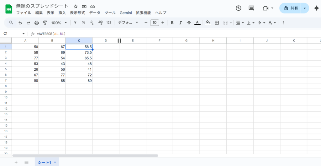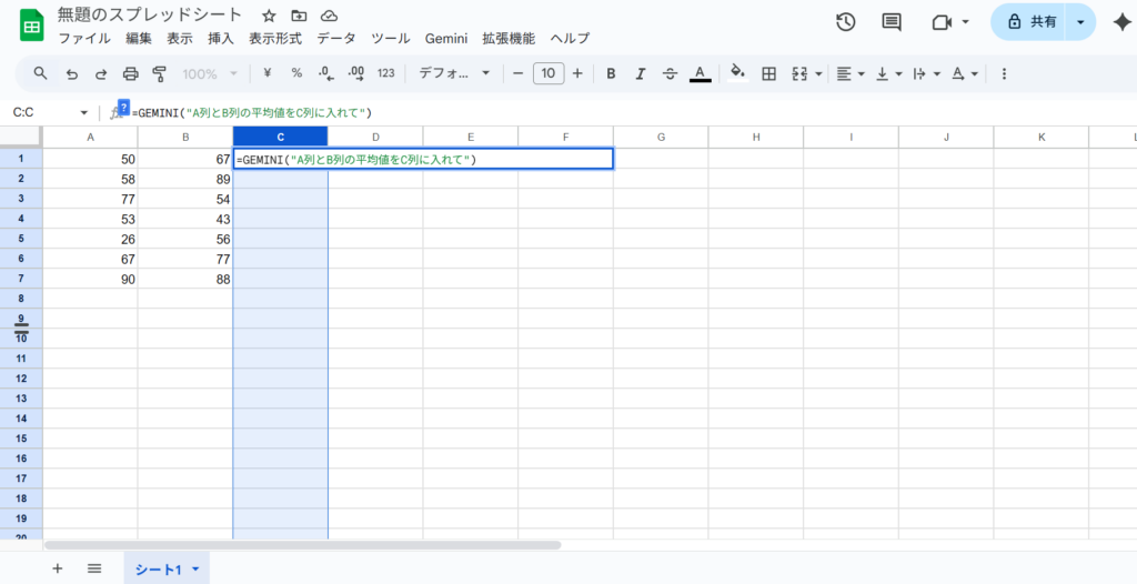 =GEMINI("A列とB列の平均値をC列に入れて")