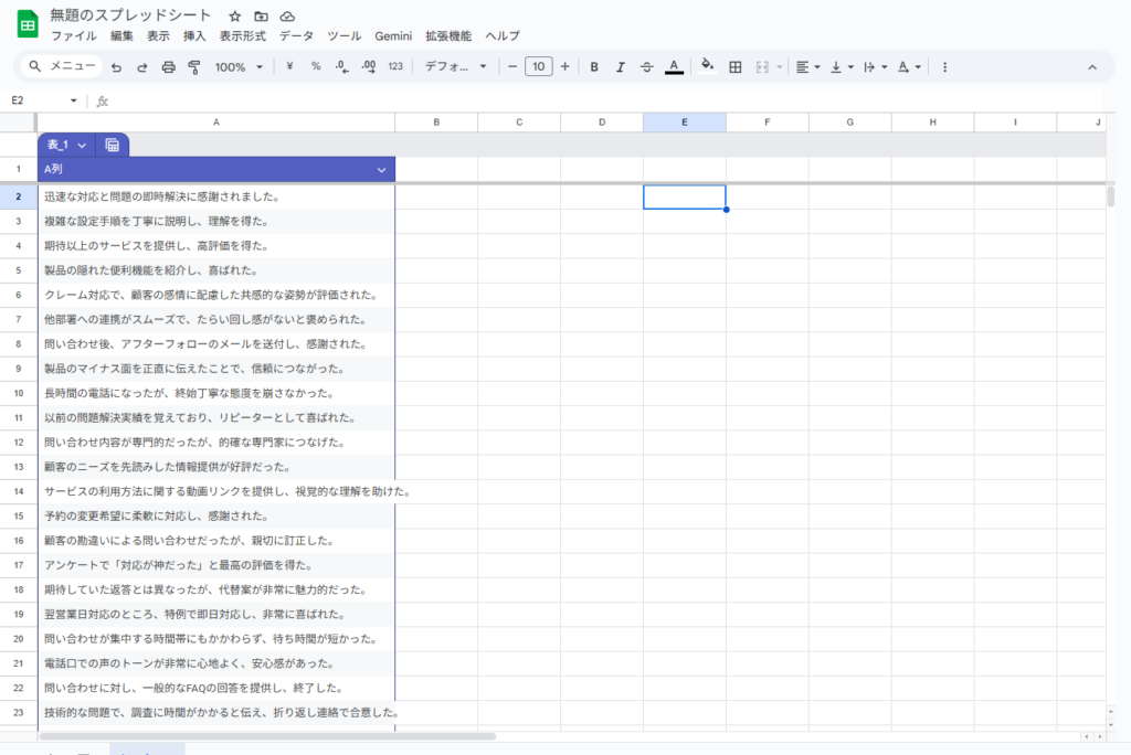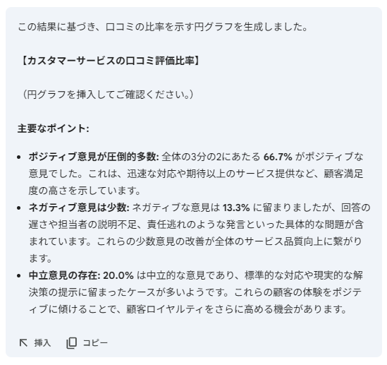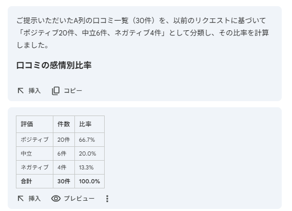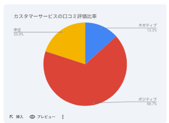 顧客アンケートやレビューなど、大量のテキストデータを分析する作業は非常に時間がかかります。Geminiを使えば、テキストの内容を読み取り、「ポジティブ・ネガティブ」の判定や、意見の要約を一括で行えます。また、シート内のデータをグラフで表示することも可能です!