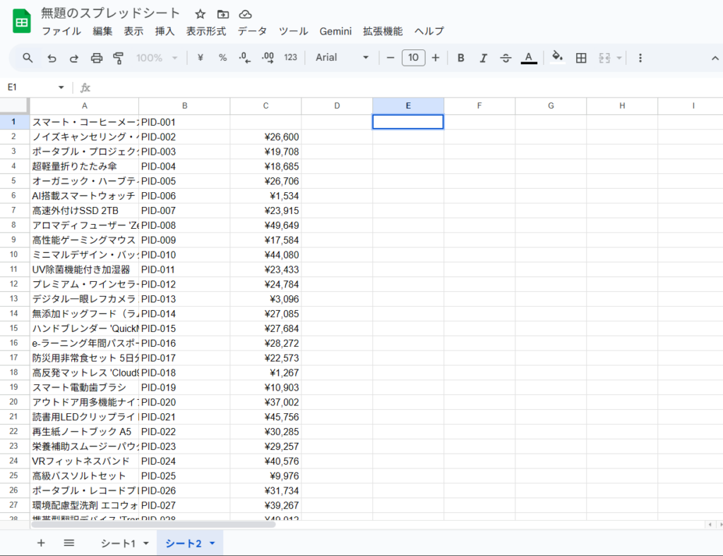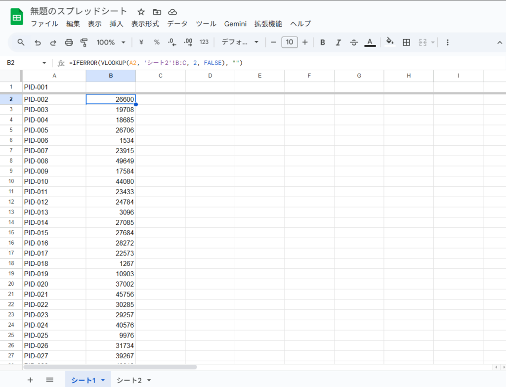 シート1のA列とシート2のB列の商品IDを使って、シート2のC列から価格を参照するVLOOKUP関数をシート1のB列に作って。エラーの場合は空白にして。