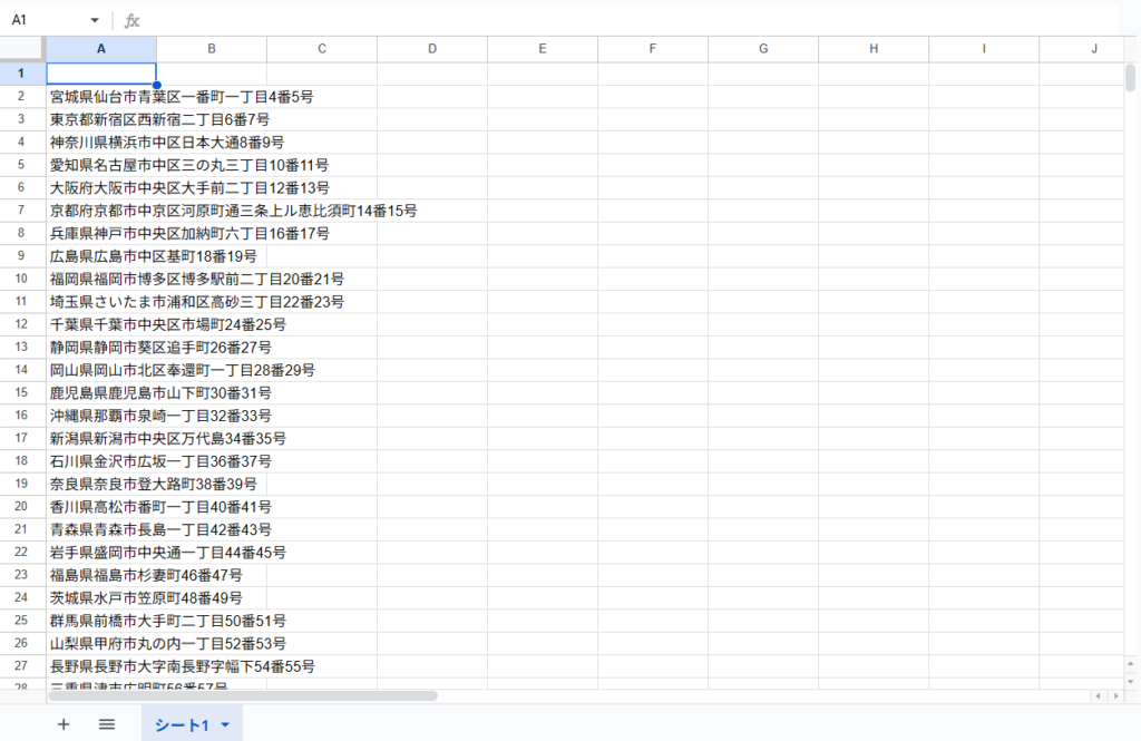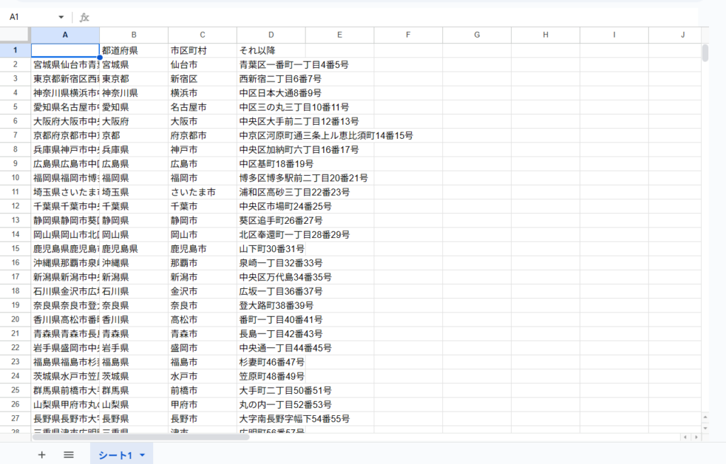 A列の住所を『都道府県』『市区町村』『それ以降』にセルに分けて出力してください。