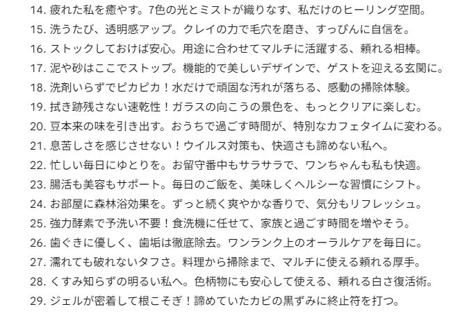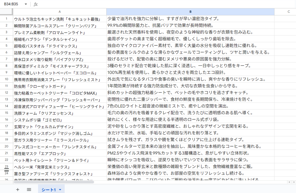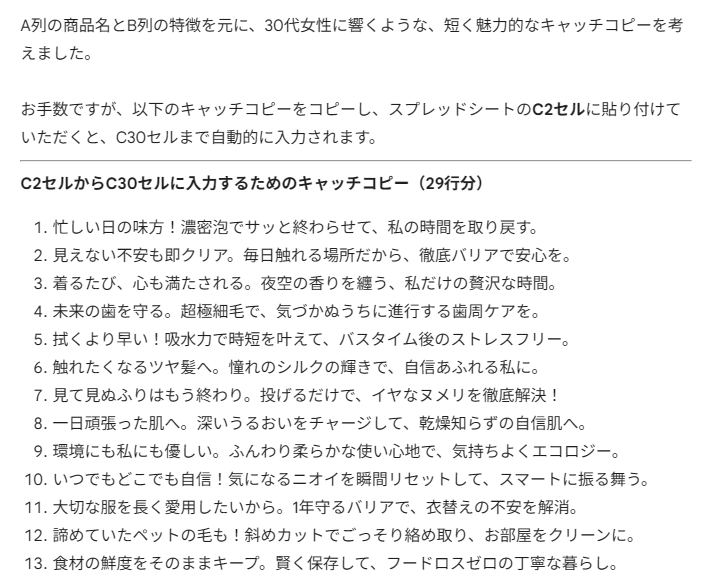 ECサイトやカタログ作成において、商品スペックから魅力的な紹介文を考える作業もAIの得意分野です。商品の特徴が書かれたセルを参照させるだけで、大量のキャッチコピーを一気に生成できます!