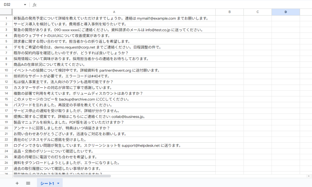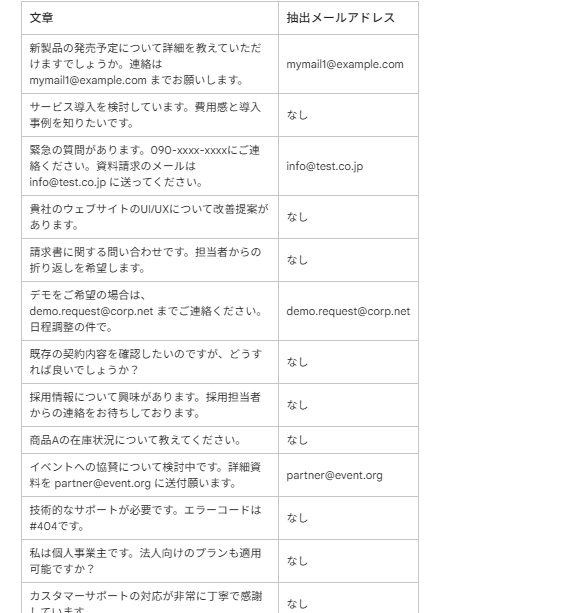 文章の中に埋もれている「メールアドレス」や「電話番号」だけを抜き出したい場合、従来は複雑な正規表現が必要でした。Geminiなら、指示するだけで必要な情報だけを抽出することができます!
