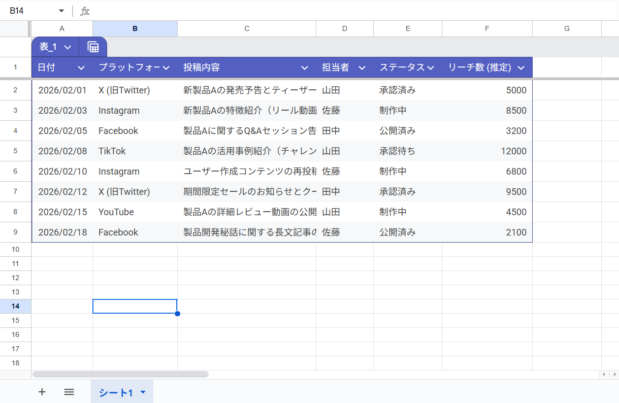 SNSマーケティングのキャンペーン管理表を作成して。項目には、日付、プラットフォーム、投稿内容、担当者、ステータスを含めて。