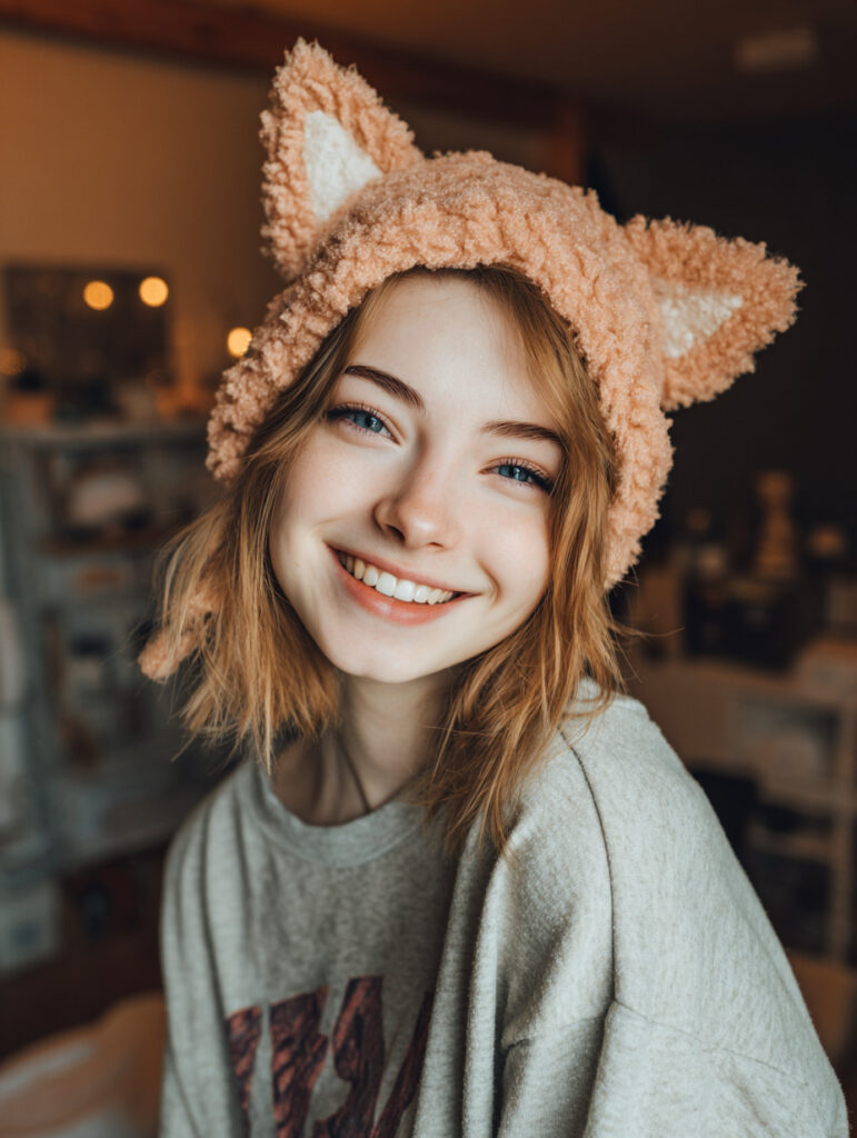 1girl, cat hat, animal ears, cute playful style, casual outfit, indoor room, soft lighting, smiling cheerful, adorable