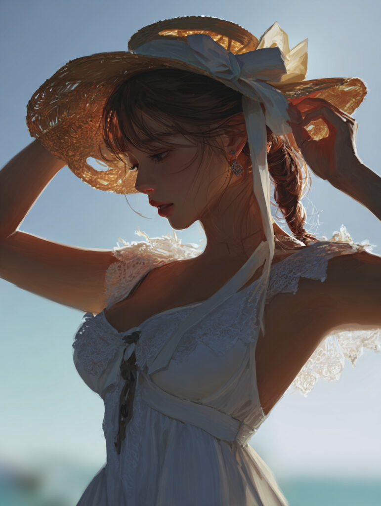 1girl, straw hat, wide brim, ribbon decoration, summer dress, beach background, sunset lighting, gentle breeze, elegant pose, serene