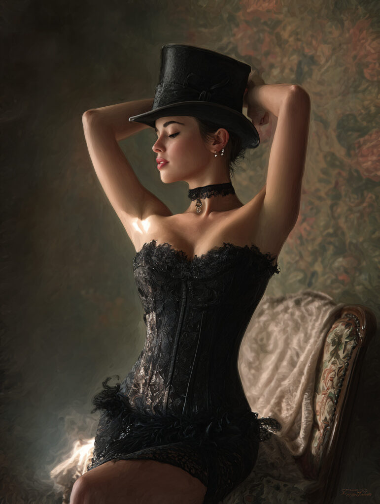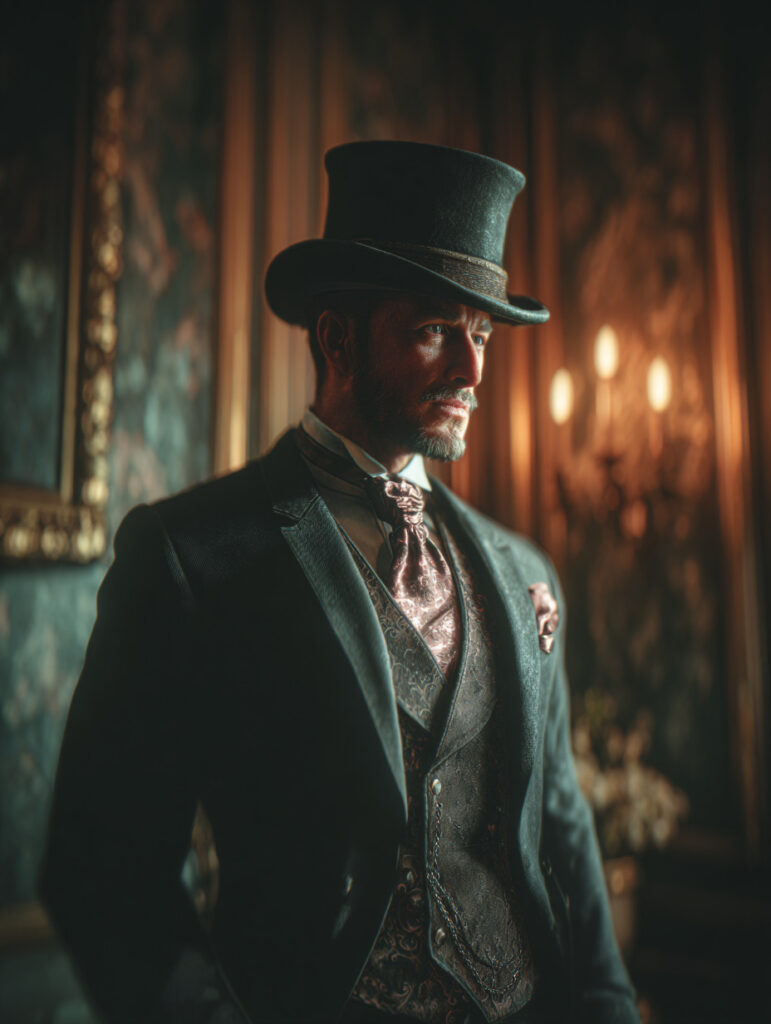 1girl, top hat, elegant formal dress, Victorian style, fancy background, sophisticated pose, graceful, luxurious atmosphere