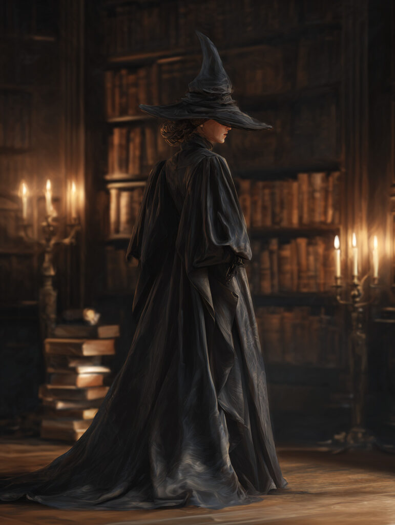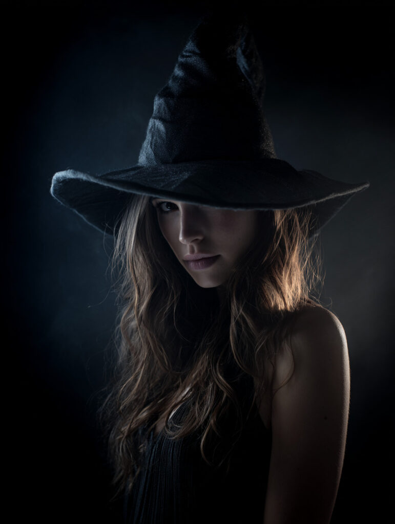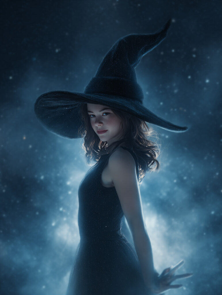 1girl, witch hat, pointed tip, black dress, magical atmosphere, night sky background, mysterious smile, casting spell pose, dramatic lighting