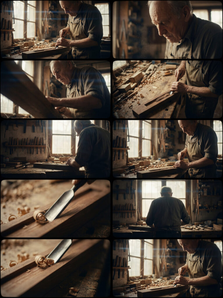 例:An elderly craftsman carefully carving wood in traditional workshop, warm lighting from window, dust particles visible in light rays