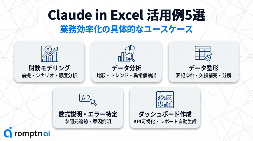 ここからは、Claude in Excelの代表的な活用例を5つ紹介します。どれも「Excelで作業しながら、Claudeに依頼→根拠セルを確認→必要なら反映」という流れで進めると、事故が少なく再現性も高いです。