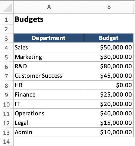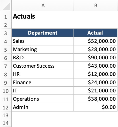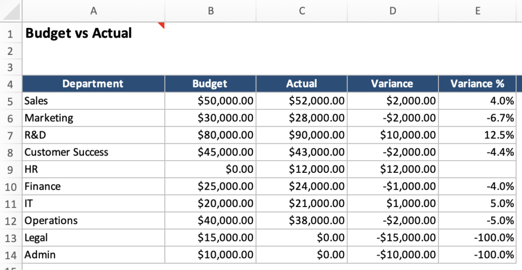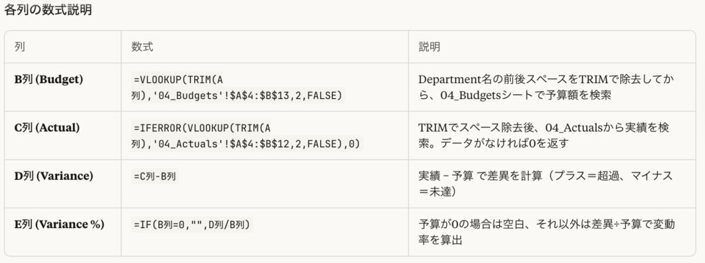 ・Budget/Actualはそれぞれ 04_Budgets と 04_Actuals を参照して取得(VLOOKUPまたはINDEX/MATCHで)