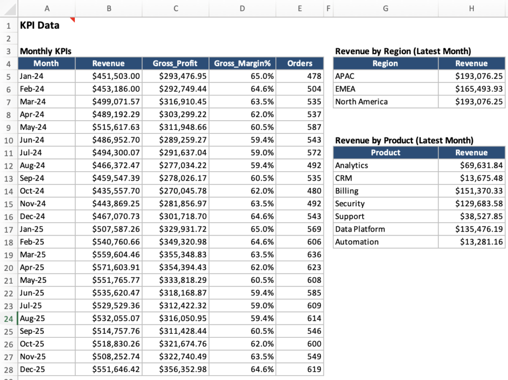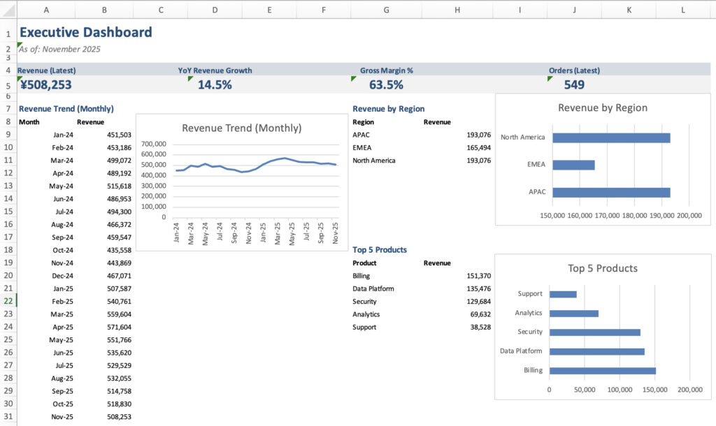 ・チャート:Revenue推移(月次の折れ線)、Region別Revenue(最新月の棒)、Top Products(上位5の棒)