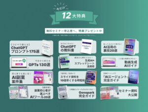 今だけ期間限定で無料セミナー申込者には、必須で知っておきたいAI知識をまとめた12大特典を無料プレゼント中です!