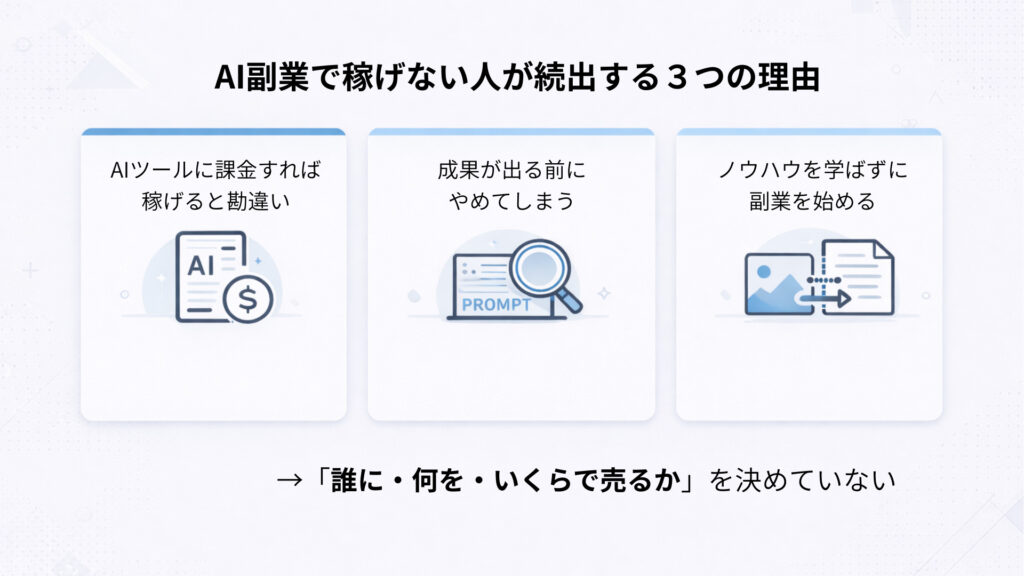 - 多くの人が、何を売るか決めないままAIツールを使い始め、成果が出る前にやめてしまっていること