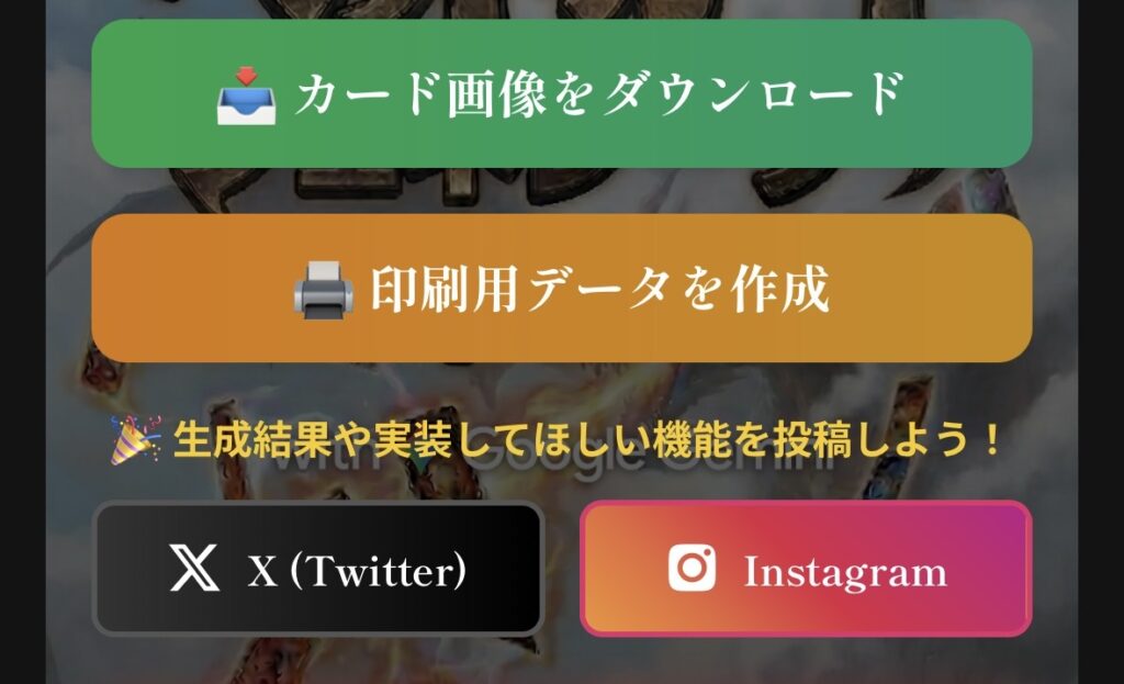 画面上には「カード画像をダウンロード」「印刷用データを作成」などのボタンがあり、用途に合わせて選べます。