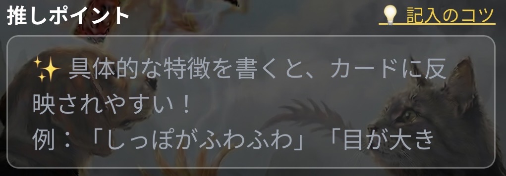 推しポイントは短くてもOKですが、気持ちを込めた言葉のほうがカードの説明文に反映されやすくなります。