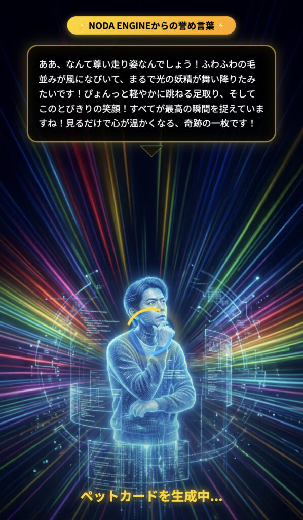 ペットカードジェネレーターは、ペットの写真をアップロードするだけで、トレーディングカード風のデザインに自動変換してくれる生成系アプリです。