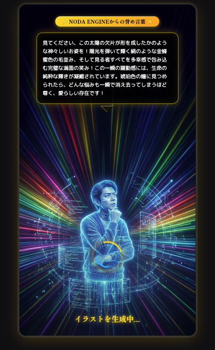 「元気」「おっとり」「食いしん坊」など、簡単な推しポイントを入力するだけで、カード用の説明文や必殺技風のテキストを自動生成してくれます。