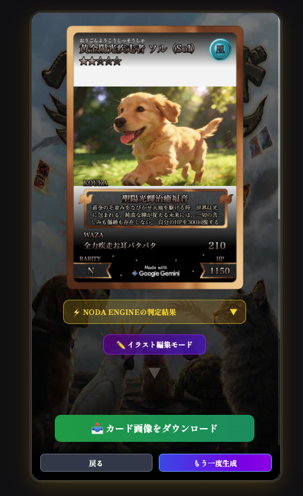 アップロードすると、フレーム・背景・レイアウトが自動で調整され、カードゲームのようなビジュアルに仕上がります。