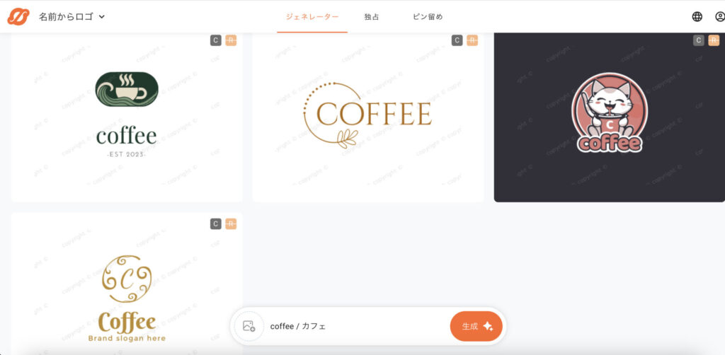 業種を選ぶだけで、数秒で複数のロゴ案が生成されます。テンプレートベースのため、極端に個性的なデザインは難しいものの、安定したクオリティで失敗が少ないのが特徴です。