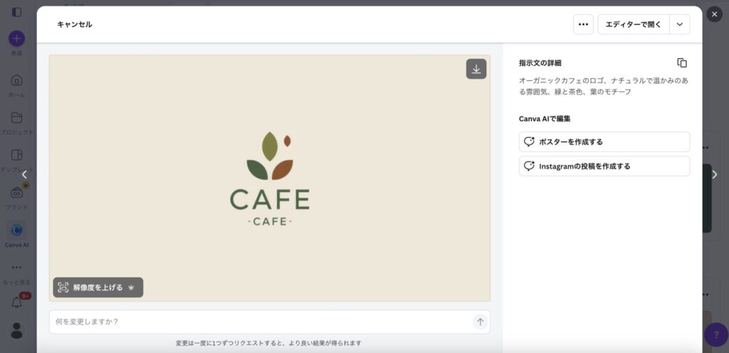 生成されたロゴが気に入らなければ、「もっとシンプルに」「色を明るく」などと会話形式で修正指示を出せるのも大きな魅力です。