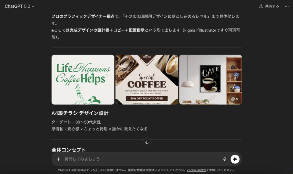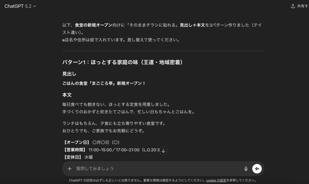 実はChatGPTひとつでもチラシ作成ができます。ただし、画像で出力されるため、レイアウトやテキストの配置は何度も指示をし直して調整する必要があります。