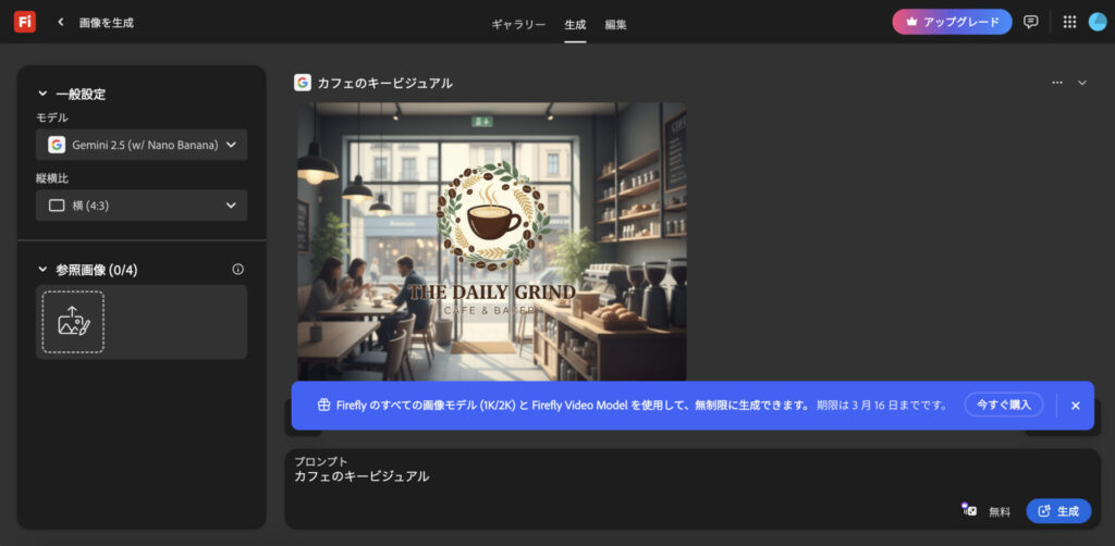 Adobeアカウントがあれば無料で月25クレジットまで生成可能(1回の画像生成で1クレジット消費)。何度も生成し直すと制限に達してしまうため、注意しながら活用してください。