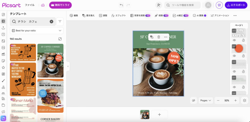 背景除去・画像補正・AIによる拡大機能など、画像加工に特化した機能が充実しています。Canva同様テンプレートも用意されており、写真を加工してそのままデザインに組み込めるのが特徴。