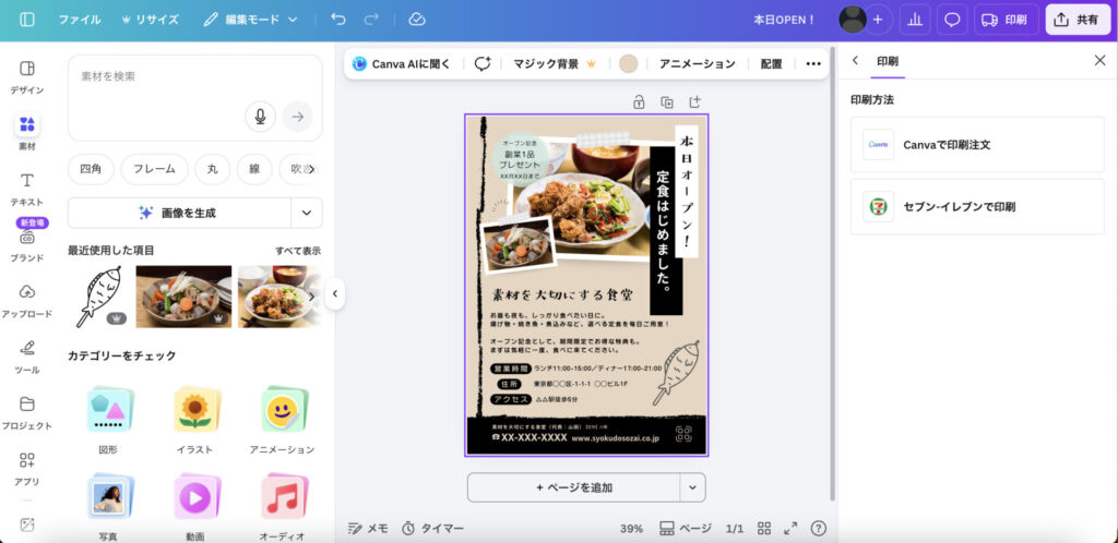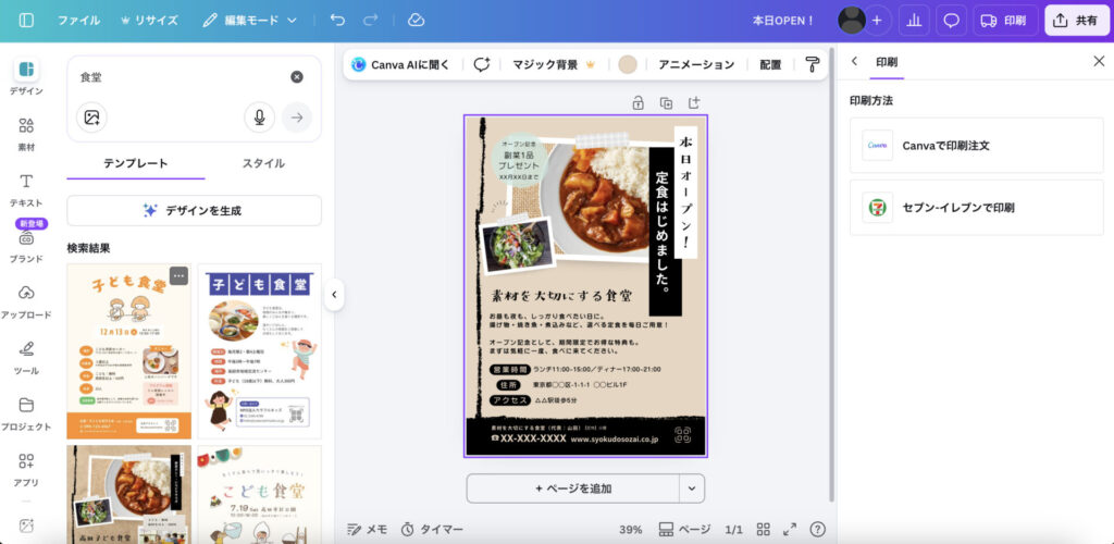 チラシ作成には、Canvaがおすすめです。近年多くの非デザイナーが活用するようになったCanvaは、AIによるテキスト生成機能や画像生成機能があるほか、そのまま使えるチラシ用テンプレートが充実しています。