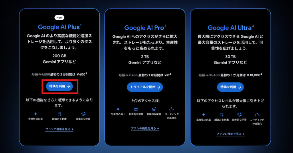 | Google AI Plus | 1,200円 | AIを日常の仕事や学習に活かしたい個人 |