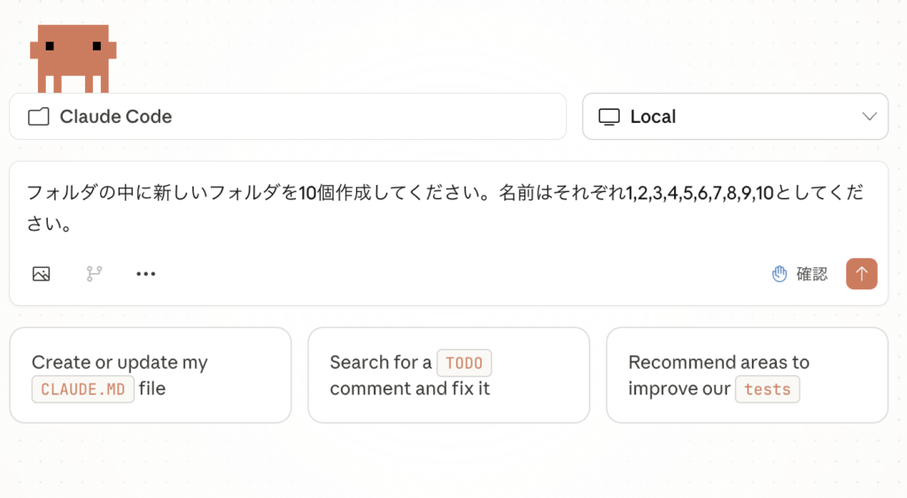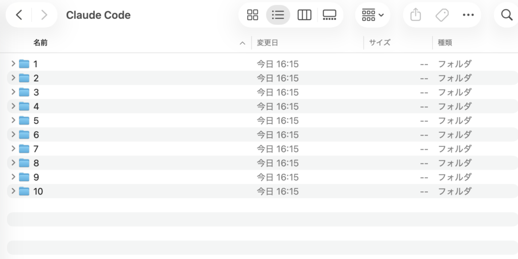 今回はPC内のフォルダに新しいフォルダを10個作成するという作業をClaude Codeに手伝ってもらいます。