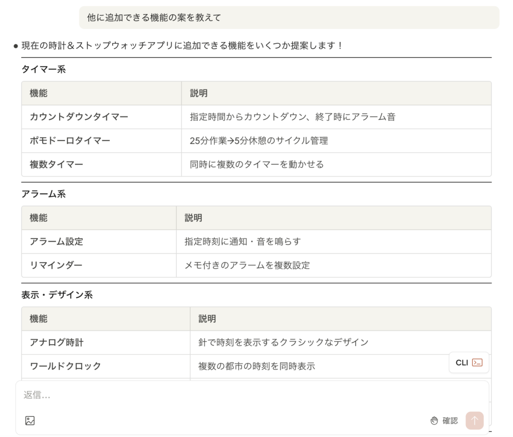 続いて、先ほどClaude Codeが提案してくれていた機能のうちの1つを追加で実装してみます。