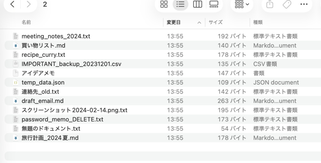 例えば以下のように、内容や形式が全く異なったファイルが1つのフォルダに散らばっている状態を想定します。この状態から整理をしようとすると、1つずつ名前を変更したりファイル形式を変更したりする必要はあって中々面倒です。