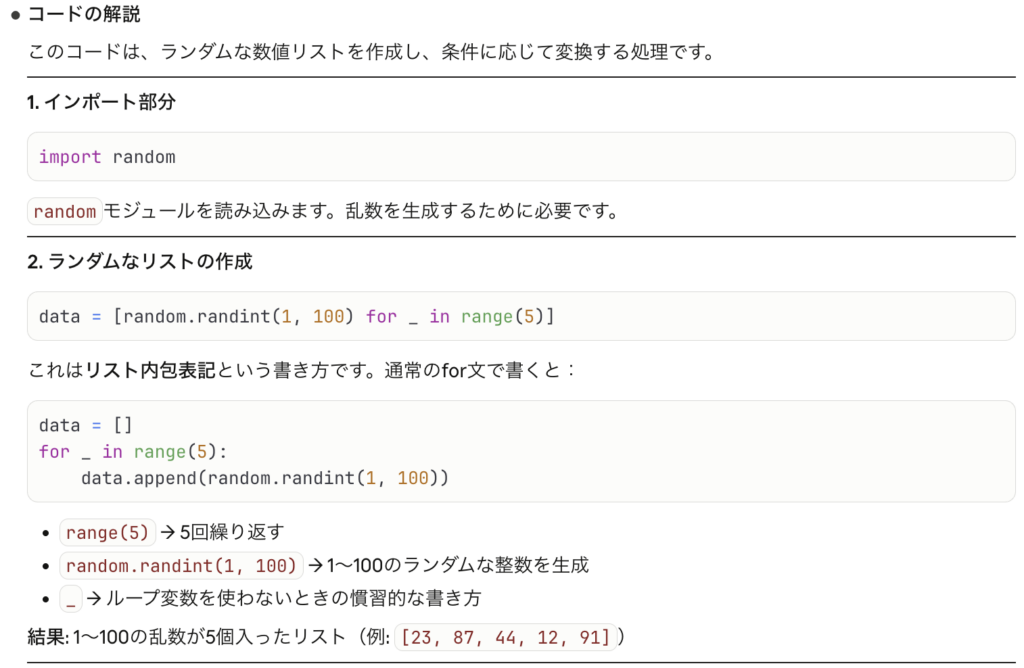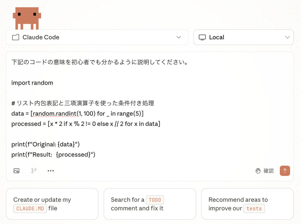 Claude Codeは自分でプログラミングについて学習する際にも活用することができます。その最も有効な方法がコードの意味をCladeに尋ね、解説してもらう方法です。