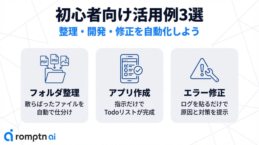 ・初心者はまず、「フォルダ整理」「簡単なアプリ作成」「エラー修正」の3つのユースケースから試すのがおすすめ
