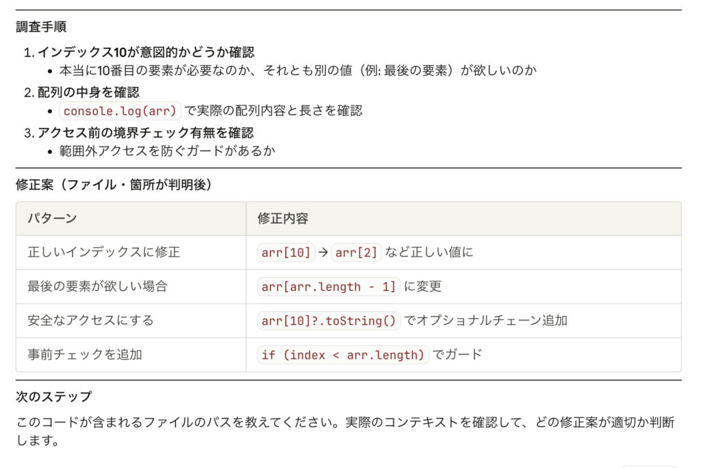 初心者がいちばん詰まりやすいのがエラー対応です。Claude Codeなら、エラー文を貼るだけでなく、プロジェクト内の関連ファイルも見ながら「原因の候補→調べ方→直し方」まで一緒に考えてくれます。