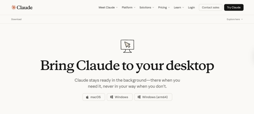 こちらのClaudeの公式ダウンロードページに遷移し、macOSなら「macOS」のボタンを、Windowsなら「Windows」のボタンを選択します。(下画像)
