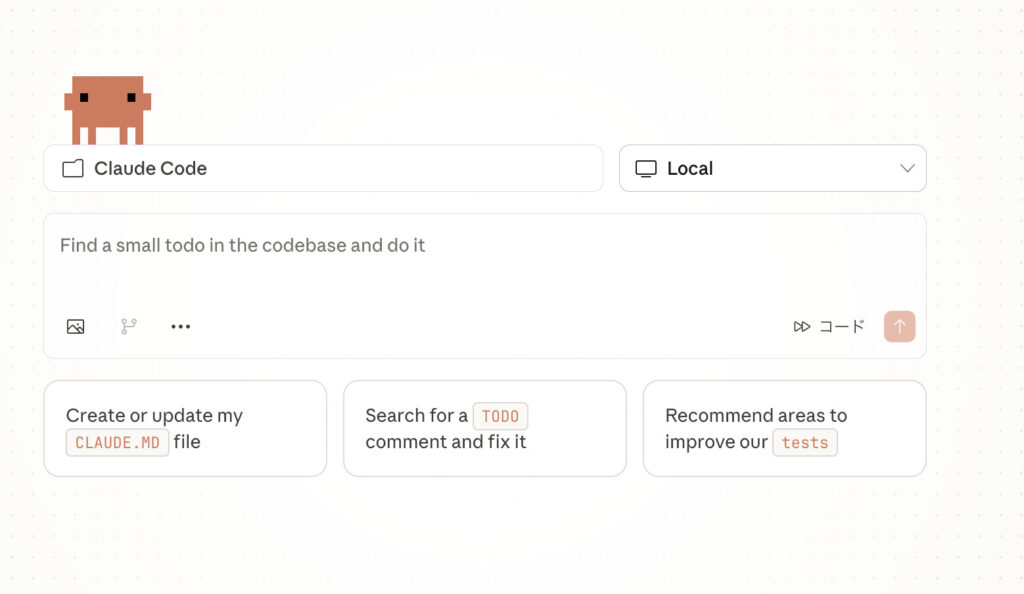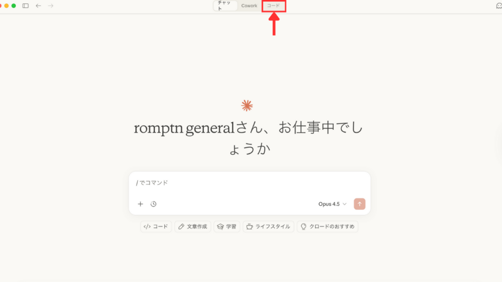 立ち上げると下の画像のような画面が表示されます。画面上部の3つの選択肢の中から「コード」となっている枠を選択するとClaude Codeを開く事ができます。
