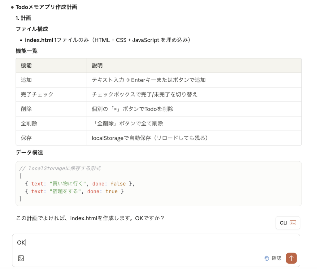「こんなことがしたい」「こんな機能がほしい」と文章で伝えると、Claude Codeがプラン立て→実装→動作確認までの流れを組み立てて、自動で進めてくれます。