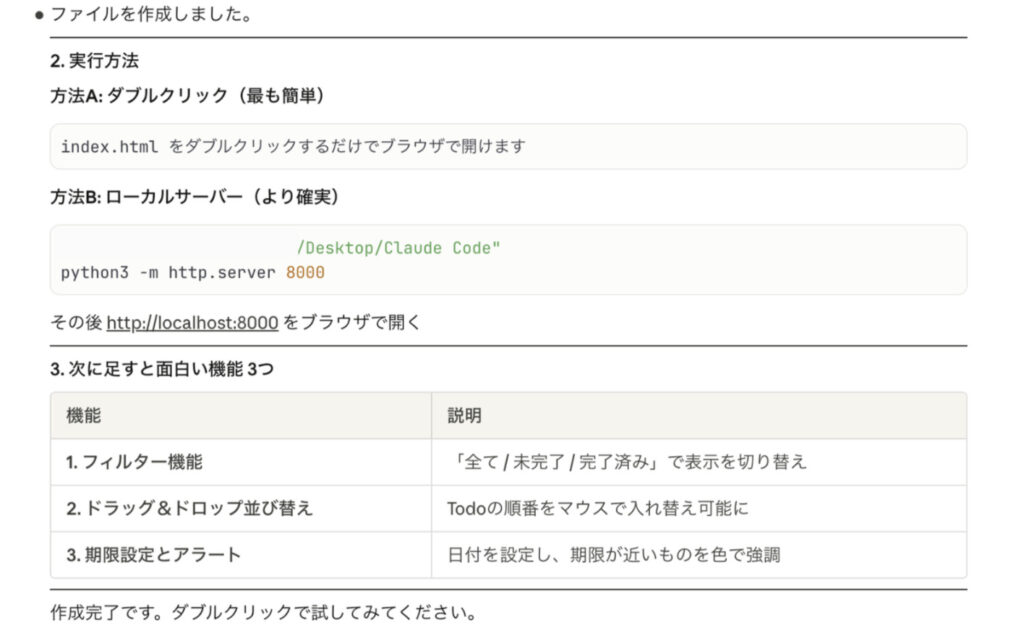 3) 実行方法を教えて(例:ファイルをダブルクリックで開く、または python -m http.server など)。